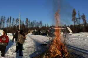 We awoke to -27 temperatures, and after breakfast we traveled along Nungesser road. We quickly encountered the cyclists who had started before sunrise on their 12hr journey towards Pikangikum First Nation. With cheers and encouragement we drove past the convoy and into Pikangikum so we could off-load our gear, music equipment and get our winter gear on. Friday’s challenge was to build a couple fires for the riders at two of their checkpoints. We didn’t have the wood with us… our task was to cut trees down (recently seasoned by the forest fires in the area) and build some bonfires. The crew worked so well together, there were laughs, some songs shared, smokies cooked over the fire for lunch. We had an amazing day serving the cyclists and we even got enough wood to bring a truck full to Nick’s trailer for heat.