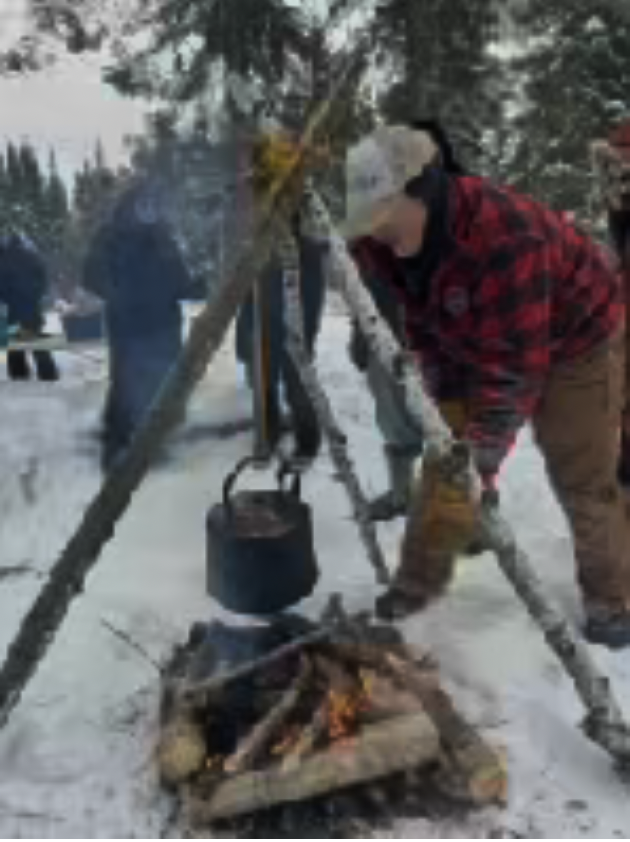We woke up to slightly warmer temperatures and made our way to the school where we made another couple fires for community events, boiled some water on a tripod fire for snowshoers and then made a fire by the rink for local youth to warm up between skating and playing hockey at the outdoor rink. There was so much to do on Saturday our